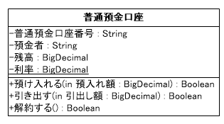 以下に、普通預金口座クラスのJavaコードの例を示します。UMLクラス図の記法やJavaの文法の詳細については、ここでは触れません。ただ、2つの形がよく似ている点に着目してください。